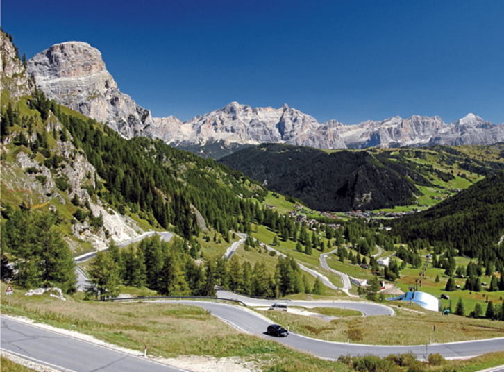 Errepidean gora Gherdeinako haran osoa ageri da atzean. Plan de Gralbatik aurrera, bidegurutzea dator: Badiara joateko Jeuf de Frea mendatea sei kilometrora dago. Beste bidea hartuta Sella mendatea dator, eta Trentino probintziako Fassa haran ladinoa. «Ez dago Hego Tirolen bezain agerian publikoki, baina gutxienez eskolan badu bere lekua azken hamarkadetan». Baina hirugarren elementua falta da, Trentinok Hego Tirolekin batera eskualde autonomoa osatu arren, probintzia italiera-hiztuna baita. Beraz, italierak askoz presio handiagoa egiten dio ladinerari.