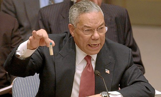 Colin Powell lau izardun jeneral ospetsua zen, AEBetako armadan gorenera iritsitako afroamerikar prestigiotsua. Berea da, baina, NBEren historian egon den gezur lotsagabe eta hilgarriena, berari egokitu baitzitzaion 2003ko otsailaren 5ean Segurtasun Kontseiluan Iraken aurkako gerra justifikatzeko “frogak” aurkeztu beharra. Eta han azaldu zen Powell, antraxa omen zuen beirazko ontzitxo bat eskuetan, satelite bidezko argazkiak erakusten, grabazioak eta salatarien hitzak aireratuz, Irakek suntsipen masiboko armak zituela erakusten zuten “froga zalantzaezinak” munduari azalduz.