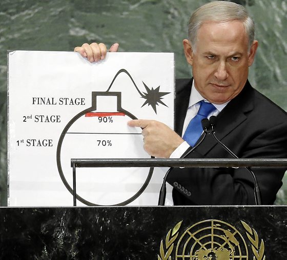 Benjamin Netanyahu Israelgo lehen ministroa ez da bereziki nabarmentzen bere erretolika orekatuagatik. NBEren Batzar Nagusiaren aurrean azaldu zen 2012ko irailaren 27an bonba nuklear baten diagramarekin, eta atrilean bertan errotuladore gorria atera eta Iranek bonba nuklearra egiteko prozesuaren %90 prest zuela adierazi zuen, munduarentzat berehalako mehatxu apokaliptikoa zela aldarrikatuz. Ez dirudi munduko agintariek serio hartu zituztenik bere marrazki eta hitzak. Izan ere, hamazortzi urte lehenago, 1996an, adierazia baitzuen jada Iran «hilabete gutxi barru» arma nuklearra lortzear izango zela. Are gehiago, Wikileaksek gerora jakinarazi zuenez, Batzar Nagusian Netanhayu diskurtso hori ematen ari zen garaian, Mossad Israelgo inteligentzia zerbitzuko buru Meir Daganek gobernuari txosten bat igorri zion Iranek arma nuklearrak lortzea ez zela berehalako gertakizuna izango baieztatuz.