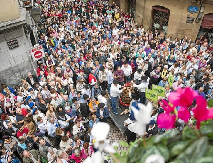 Todo arrancó con una kalejira de txakolineros de las seis comarcas que conforman la Denominación de Origen Bizkaiko Txakolina, con parada en la plaza Santiago, donde cinco dantzaris ataviados con trajes suletinos bailaron la Godalet Dantza ante igual número de vasos rodeados de turistas ávidos de atrapar una «imagen típica». Para cuando la comitiva llegó frente al edificio de La Bolsa, había más de un centenar de personas aguardándoles, que se fueron incrementando mientras los txakolineros de Durangaldea, Uribe, Enkarterriak, Lea-Artibai, Urdaibai y Nerbioi vertían las uvas que habían acarreado en cestos en la prensa para obtener el primer mosto de 2015. Costó pero el caldo brotó y hubo opción de degustarlo.