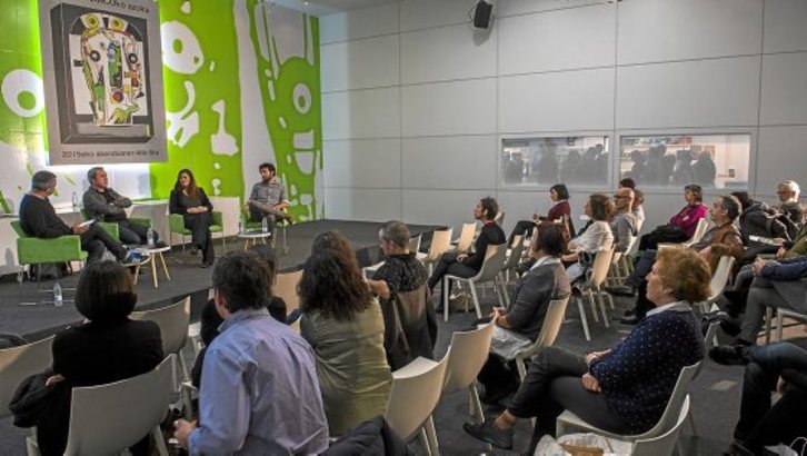 Ahalegina behintzat egin zuten atzo Fermin Etxegoien, Eider Rodriguez eta Koldo Almandozek. Hiru bisaia ikusgarri euskal kulturaren munduan, bai musikagintzan, bai literaturan, bai zinemagintzan. Hamaika lanen egile dira hirurak, bakoitza bere eremuan, baina iritzi desberdinak dituzte sorkuntzak hiritarren aurrean duten ikusgarritasunaz. «Zer esan... Hartzen duzun ikuspegiaren arabera. Ekitaldi honek badu ikusgarritasuna. Berriki estreinatu da ‘Amama’ filma, izan du ikusgarritasuna euskal hedabideetan. Aurreko astean ere aurkeztu nuen liburu bat gazte literaturakoa, bost egunkari etorri ziren, telebista eta irratiak. Ikuspegia hori baldin bada, egiten ditugun gauzak plazaratzen ote diren, ba al duten tokia hedabideetan, nik ez nuke ezetz esango. Hiru hilabete barru liburu horrek eutsiko dio eskaparatean egoteari? Badakigu ezetz», horixe Fermin Etxegoienen sarrera.