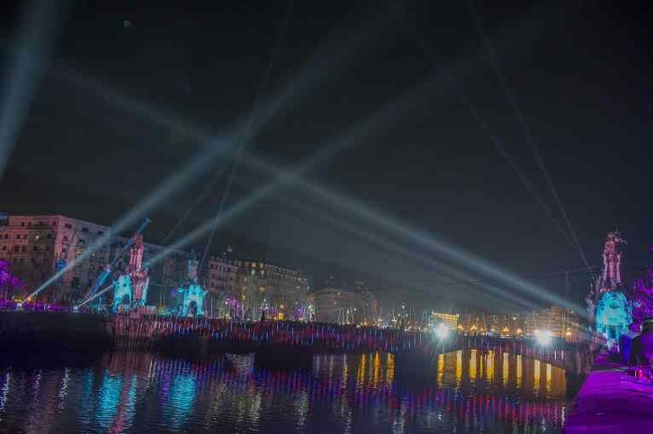 Aurreko egunetako eskaerei erantzunez, goiztiar bildu zen jendea Maria Cristina zubiaren bueltara, Urumea ibaiaren bazterreko leku onenak beren egiteko asmoz. Ikuskizuna abiatu baino ordu erdi lehenago, 36 fokuk zeruan bat egin zuten beste horrenbeste argi ilara igorri zituzten, ikusleak argiek osatzen zuten piramidearen barnean kokatuz. Ikuskizunak ekarriko zuenaren iragarpena izan zen.