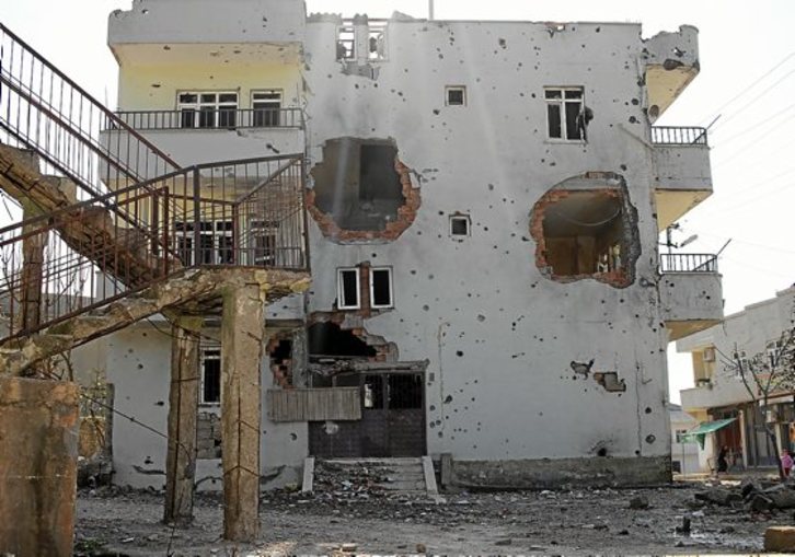 «Mire lo que ha hecho el Estado con nuestras casas, con nuestros hijos. Apoyo las zanjas, la lucha por la libertad de nuestro pueblo», aseveraba en marzo una señora cuyo velo blanco dejaba entrever su canoso pelo. «Tengo miedo a que el Estado me torture, ya lo ha hecho antes con quienes hablan», insistía. Reside en el barrio de Zap, el embrión de la resistencia kurda en Silopi. Allí las casas describen la cruenta lucha: algunas han desaparecido, otras tienen la segunda planta a punto de derrumbarse, casi todas marcas de bala. En mitad de las ruinas aún quedan pertenencias de quienes abandonaron su vida por la lucha. Es la imagen de una guerra.