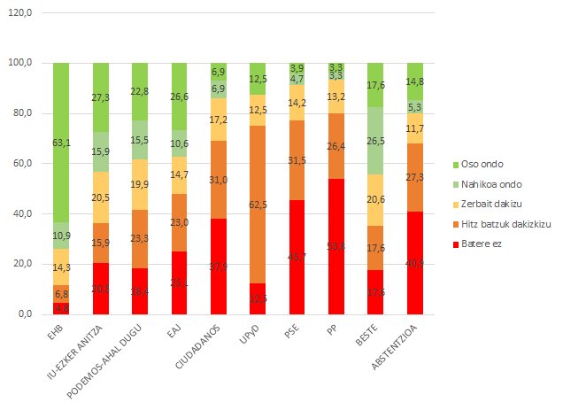 Antzerako datuak dira PSE eta Ciudadanoseko boz-emaileenak. Lehenen artean %45,7ak ez du euskara ezagutzen, eta %37,5eko ezagutza eza da Ciudadanoseko jarraitzaileen artekoa.