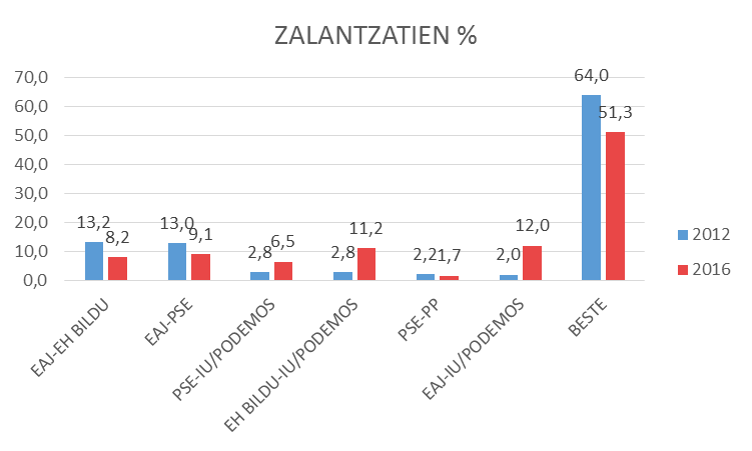 Zalantza noren artean duten, hori bai, hori aldatu da. Orain lau urteko hauteskundeetan zalantza gehien EH Bildu eta EAJren artean zituen jendeak, kanpaina ere hala garatu zen, bi indarren irabazteko aukeraren bueltan jardun baizuen askok. Asko jaitsi da portzentaje hori, %13,2tik %8,2ra. Antzeko neurrian jaitsi da EAJ eta PSEren artean zalantzan zirenena ere, %13tik %9,1era.