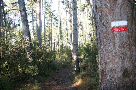 2,22 km. En el pinar de la zona superior, veremos cómo del camino sale hacia nuestra izquierda una senda y las marcas rojas y blancas siguen recto por el camino principal. Nos saldremos de la GR y seguiremos por la senda de la izquierda para bordear el fuerte de Ezkaba por nuestra izquierda, es mucho mas bonito.