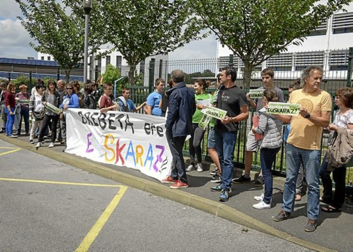 Kolegioko gurasoekin kalakan atzeman genuen Jurgi Arrizabalaga, Piarres Larzabal kolegioko lehendakaria. Zangoak atarian eta burua ikastetxe barrenean zituen, bere semeetako bat patioan baitzen, azterketa egiteko prest. «Debate gutxi egon da gure etxean, galdegin genion semeari zein hizkuntzatan egin nahi zuen zientzia arloko proba eta berak euskaraz egin nahi zuela esan zuen berehala», kontatu zion GARAri.