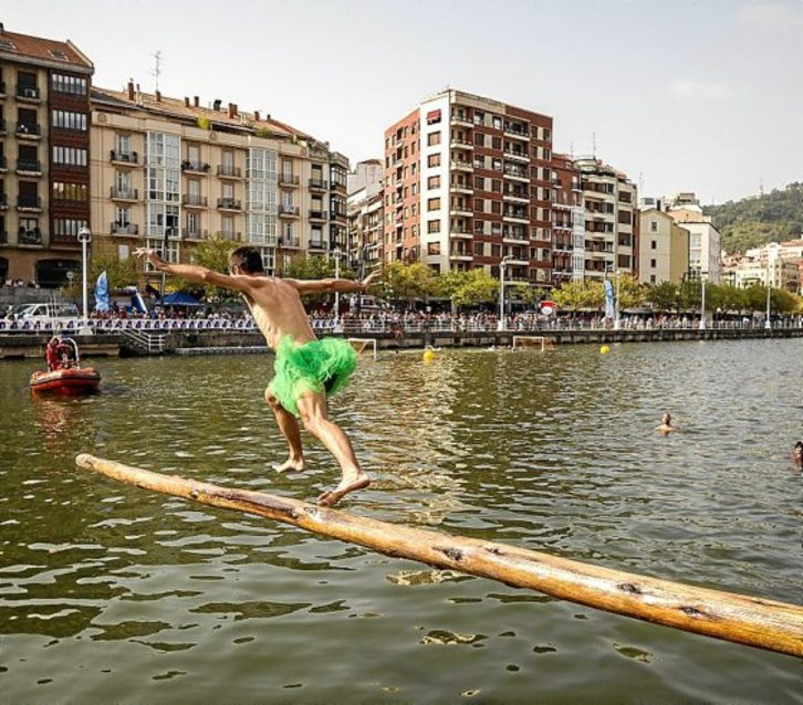 Divertida, especialmente para los espectadores, fue la cucaña que tuvo lugar a la tarde en la Ría. La destreza de algunas y algunos encima del mástil ensesado quedó demostrada.Aritz LOIOLA | ARGAZKI PRESS