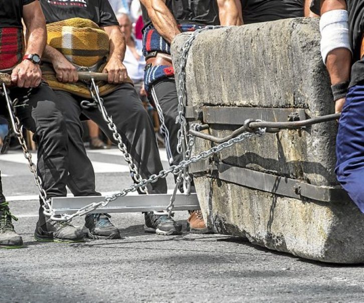 Bost jarri ziren aurrean kateetatik tiraka eta bi atzean, eta publikoak gogotsu jarraitu zuen erronka. Gehienez harria bi untze mugitzea espero bazuten, ia 70 metro mugitu zuten azkenean, izerditan blai eta txalo zaparrada artean, herri kirol munduan historia egin duen marka ezarri izanaren sentsazioarekin.