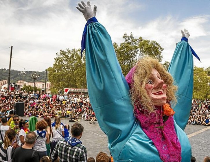 Las comparsas son las protagonistas de Aste Nagusia, y ayer lo volvieron a demostrar. Celebraron unas pruebas de herri kirolak un tanto particulares y procedieron a la entrega de las banderas azul y marrón. Este último galardón, como era de esperar, se lo llevó el Obispo de Bilbo. El premio Palmada fue para Altxaporrue.