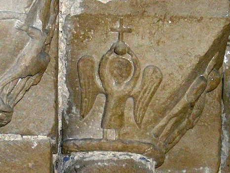 Esta iconografía se trasladó en la Edad Media al propio San Miguel, que aparece vestido de guerrero alado, con coraza romana y escudo, dando muerte al monstruo que representa el mal, y que en ocasiones aparece con figura humana.