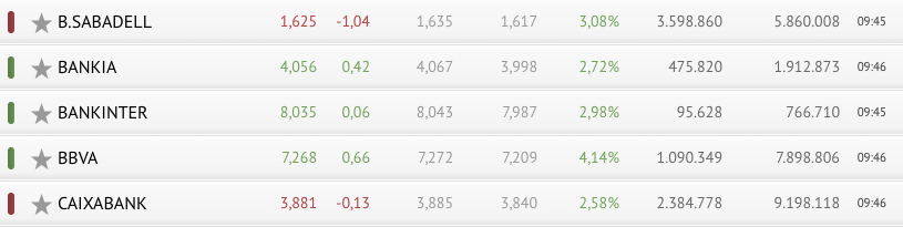 Zail da bien arteko erlazio zuzenik egitea baina 9.45ean bankuen burtsako joerei begiratuz gero Sabadell eta Caixabank dira beheranzko joeran ageri ziren bakarrak: