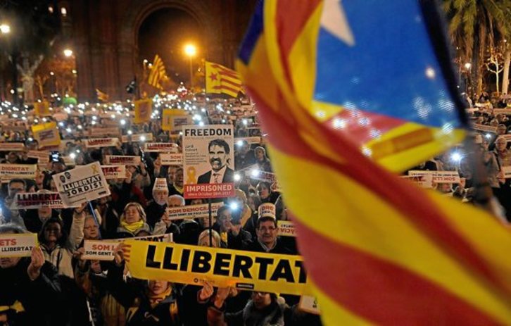 Garaipenaren Arkuan, Kataluniako Auzitegi Nagusiaren egoitzaren ondoan egindako ekitaldian hiru minutuko isilunea bete zuten, eskuak goratu eta mugikorrekin argia eginez, bi “Jordiak”, Oriol Junqueras eta Joaquim Form preso dituzten Soto del Real eta Estremeraraino ailegatu zedin.
