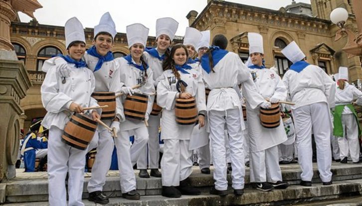 Cada vez que una niña o niño participa en la tamborrada infantil recibe una medalla conmemorativa. En la foto fácilmente podemos distinguir a las más veteranas, aunque los novatos no tardarán en acumular un buen puñado en su pechera. Ayer cerca de 8.000 niños salieron a desfilar por las calles de Donostia, casi 5.000 lo hicieron por las calles del centro y más de 3.000 en los barrios. Justo antes del medio día, la Bella Easo y su séquito saludaron desde el balcón del ayuntamiento a todos sus compañeros para después subirse a la carroza que les pasearía durante un par de horas.Juan Carlos RUIZ | ARGAZKI PRESS