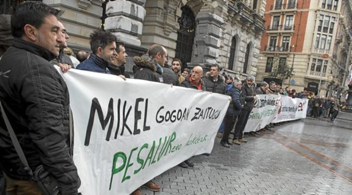 Pesalur-eko langile eta batzordeko ordezkariak Bizkaiko Diputazioaren aurrean elkarretaratu ziren herenegun hildako autobus gidaria gogoan izan eta sektorearen prekaritatea salatzeko. «Mikel, gogoan zaitugu», pankartaren atzean mobilizatu ziren, ordu erdi baino gehiago iraun zuen isilunea eginez, eta Bizkaiko autobusak dolu-xingola beltzarekin ibili ziren egun osoan zehar.