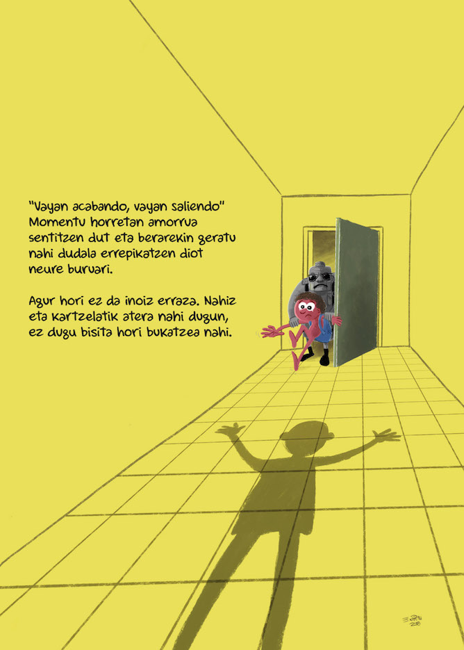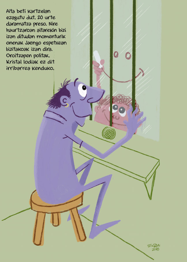 Aita espetxean duen neskato honek bisitak zer nolakoak diren azaldu du. Zenbatzen ikasi orduko, espetxean sartu eta aita besarkatu arte igaro beharreko bederatzi ateak zenbatzen zituela ekarri du gogora.
