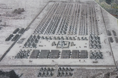 Las fotografías aéreas revelaron que ese cerro está rodeado de un recinto artificial de carácter defensivo. En este caso las defensas no fueron construidas con murallas de piedra sino mediante fosos y terraplenes, aprovechando la favorable orografía del terreno. Este campamento romano ocupaba unos 30.000 metros cuadrados de superficie, y su perímetro estaba reforzado por una empalizada que protegía las tiendas de campaña de los legionarios frente a posibles ataques.