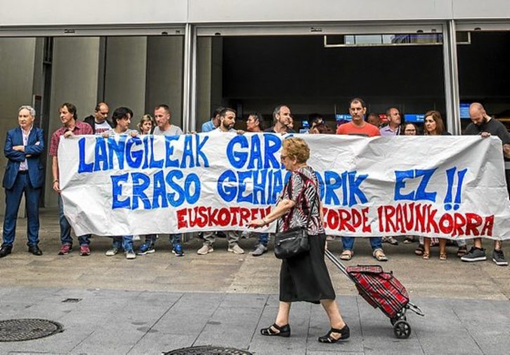 Integrantes del Comité Permanente de Euskotren se concentraron ayer frente a la estación Zazpikaleak para protestar por la agresión sufrida por un trabajador de la plantilla el pasado sábado «en el ejercicio de sus funciones», subrayando que «no es un hecho aislado».