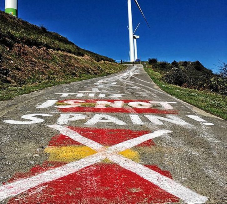 Las rampas que dan acceso a la cima del Monte Oiz, donde esta tarde concluirá la etapa de la Vuelta con salida en Getxo, aparecieron ayer por la mañana con banderas españolas pintadas, presumiblemente, por guardias civiles y policías españoles que no se cortaron en añadir lemas en favor de su equiparación salarial con la Ertzaintza. Posteriormente, sobre estas pintadas aparecieron otras en inglés en las que se recordaba que Euskal Herria no es España.