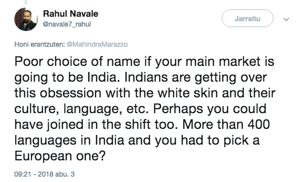 Euskal Herrian guztiari izena ingelesez jartzeko joera dagoen honetan, hara non Indian euren salgaiei euskarazko izena... Han ere izan da Mahindra etxeari izen bila Europara joatea kritikatu dionik, «400dik gora hizkuntza Indian eta Europako bat hartu duzue?». Indian azal zuriarekiko eta hauen kultura eta hizkuntzekiko joera gainditzen ari direla dio txiolari honek eta europar hizkuntza bat baliatzeak kalte egingo diela.