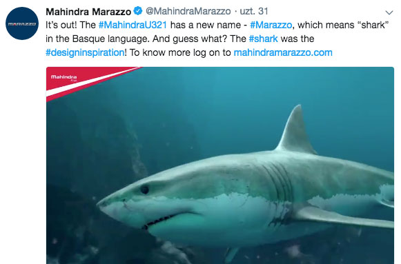 Goiko bideoa Mahindra Marazzo berriaren promoziokoa da, «marrazoa bezain leuna, marrazoa bezain isila» leloarekin zabaldutakoa. Uztailaren 31tik iragarria zuten Indiako auto-ekoizle hauek euren auto berriaren izena, jatorria euskarazko 'marrazo' hitzean zuela adierazita, gainera: