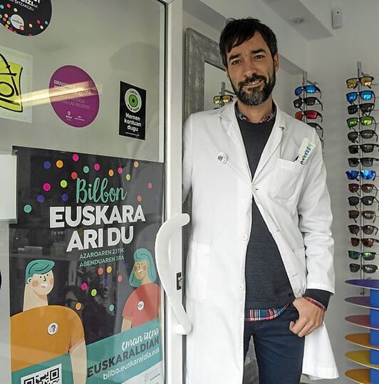 A Erlantz Astorkiza, algunos clientes que acuden a su óptica en Otxarkoaga se dirigen en euskara. Estos días, aquellos que no lo saben lo tienen más fácil al verle con la chapa Ahobizi en la solapa. Este barrio obrero no es tan euskaldun pero sus comerciantes se han querido implicar en el reto de lograr once días en euskara. Desde Optikari, el negocio que puso en marcha hace siete años, pretende hacer más fácil a los euskaldunberris que se expresen en ese idioma y él también hacerlo con naturalidad.