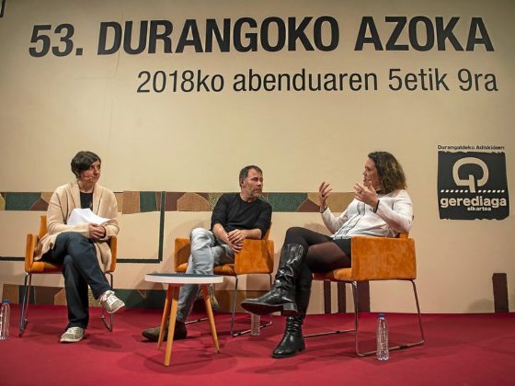Ipar-Hego konexio horretan, Maialen Errotabehere bere hautuaz aritu zen. «Musika maite dut, kantua bereziki. Baina euskaraz sortzea beste gauza bat izan da bizitzan, bereziki galdu nuelako euskara zenbait urtez eta erdia nintzen. Hizkuntza berreskuratzeak on egin dit, kontuan hartu dut ere nire musika, nire kantuaren egiteko manera eta horretan antzeman ditut gauza biziki inportanteak enetako». Euskal tximino bikoa atzo Azokan. Maia Muruaga moderatzaile-domatzaile.