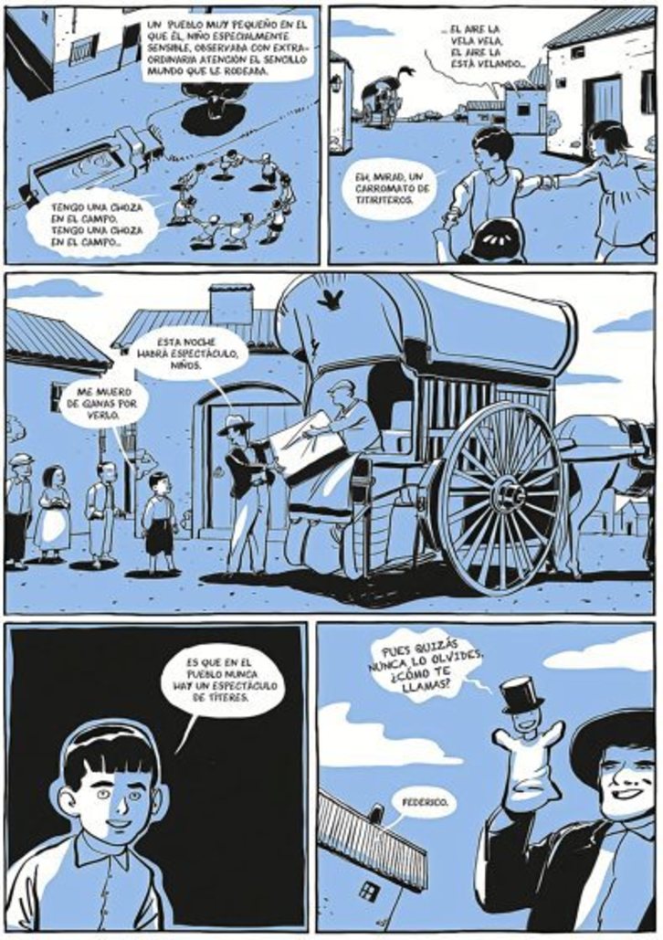 –A ver, fuera todos–, ordena un guardia fascista. –Subid a los coches–. Arrancan los motores que ponen melodías a una oscura madrugada. La canción se detiene en un ambiente cada vez más sórdido. –Venga, abajo–. Un olivo, una camioneta y otros vehículos forman la instantánea. –Bang! Bang! Bang! Bang!–, gritan las balas. –Este aún se mueve–, dice uno de ellos. –Le he metido dos tiros en el culo, por maricón–. Es la muerte de Federico García Lorca (Fuente Vaqueros, 1898 - Camino de Víznar a Alcazar, 1936). Y es así como la han reflejado el hispanista Ian Gibson y el dibujante Quique Palomo en el cómic “Vida y muerte de Federico García Lorca” (Ediciones B). En la portada, el crimen es todavía más explícito: Una mano anónima empuña un revólver frente a un poeta arrodillado, con otro guardia y el olivo como testigos. «El final del interior es un preámbulo a la muerte, y es mi manera de generar un distanciamiento con la narración tal y como venía sucediendo hasta el momento y que haya un cambio. Es como silenciar la imagen», describe Quique Palomo las últimas páginas del cómic.