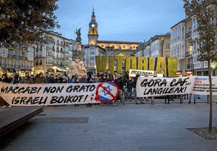 Claro que la realidad diaria tiene otros colores no tan amables, sobre todo con la población palestina, a la que el estado de Israel maltrata a su antojo –resulta curioso que la Sudáfrica del Apartheid siempre pudo viajar libremente a Israel, aun después de verse bloqueado por el resto del planeta–, y por las servidumbres que provoca su movimiento por Europa. Es por eso que la visita del Maccabi de Tel Aviv siempre levanta ampollas y protestas, porque bajo la alfombra de ese sol radiante y esas playas y esas maravillas, hay demasiada podredumbre. Será por eso que la Plaza de la Virgen Blanca vivió en la tarde de ayer una concentración organizada en conjunto por Gasteiz-BDZ –Boikota, Desinbertsioa, Zigorra–, Indar Baskonia, Iraultza 1921 y la Comunidad Islámica-Árabe de Gasteiz, al grito unánime de «Maccabi non grato» y «Boikot a Israel» y que reunió a decenas de simpatizantes de estos grupos y varios espontáneos más.