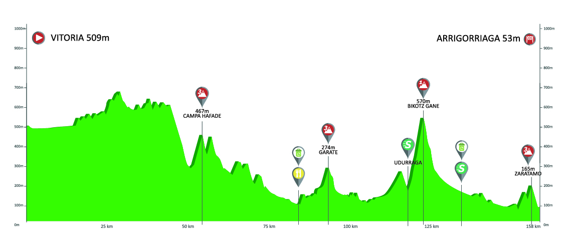 Eta hori gutxi balitz, eguneko menuak ere tropelaren kontrola zailduko du. Txirrindulariek, bidean, lehen mailako Bikoitz Gane (4,9km %8,6an) topatuko dute helmugatik 37 kilometrora eta hirugarren mailako beste hiru mendate ere: Campa Hafade, Garate eta Zaratamo gaina. Azken honetatik helmugara bitarte hiru kilometroko jaitsiera izanen da.
