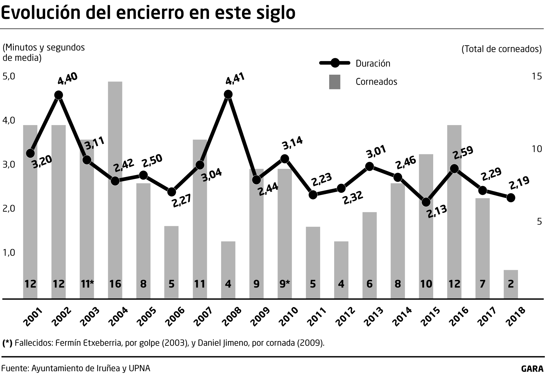 Gracias a ellos, y también al antideslizante aplicado desde 2006 en el recorrido (1.500 litros este año), se han extinguido prácticamente aquellas caídas de toros que, sobre todo en la curva de Estafeta, rompían la manada. Y así fue como, por primera vez en la historia desde que existen datos fiables, en 2018 ninguno de los ocho encierros superó los tres minutos de duración, y solo produjeron dos cornadas, ambas menos graves.