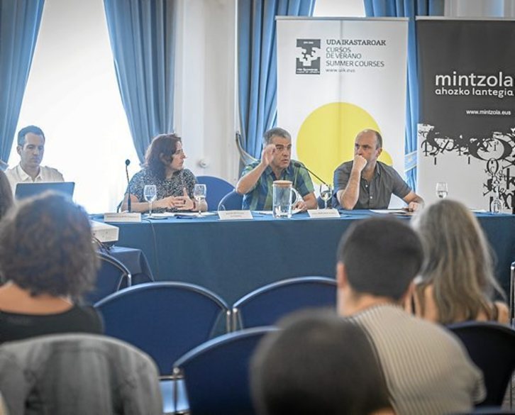 Bana-banako mintza-saioen ostean, mahai-inguruan bildu eta ikastaroan izena eman dutenekin solasean aritu ziren Josu Amezaga, Iratxe Retolaza eta Harkaitz Zubiri, hirurak EHUko irakasleak eta kulturako alor ezberdinetan berezituak, Karlos Aizpurua moderatzaile lanetan zutela.