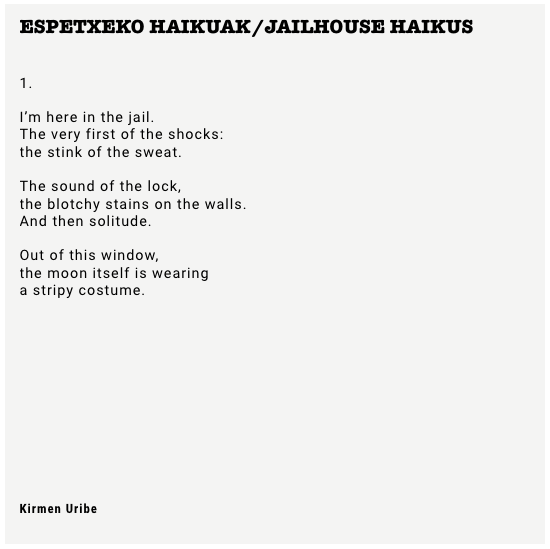 Aurretik ere Uriberen testuak itzuli dituen Elizabeth Macklin-ek egin du lana eta orain ‘Poetry Intenational’ atarian dago irakurgai ‘Espetxeko haikuak’ izeneko testu zatia. Honakoa «derrigorrezko soldadutzari intsumiso izatearren igarotako kartzelaldia» du ardatz, idazleak berak azaldutakoaren arabera. Webgune horretan poesia testu sorta hori eta Harkaitz Canoren zazpi poema solte daude soilik euskaratik ingelesera itzuliak.