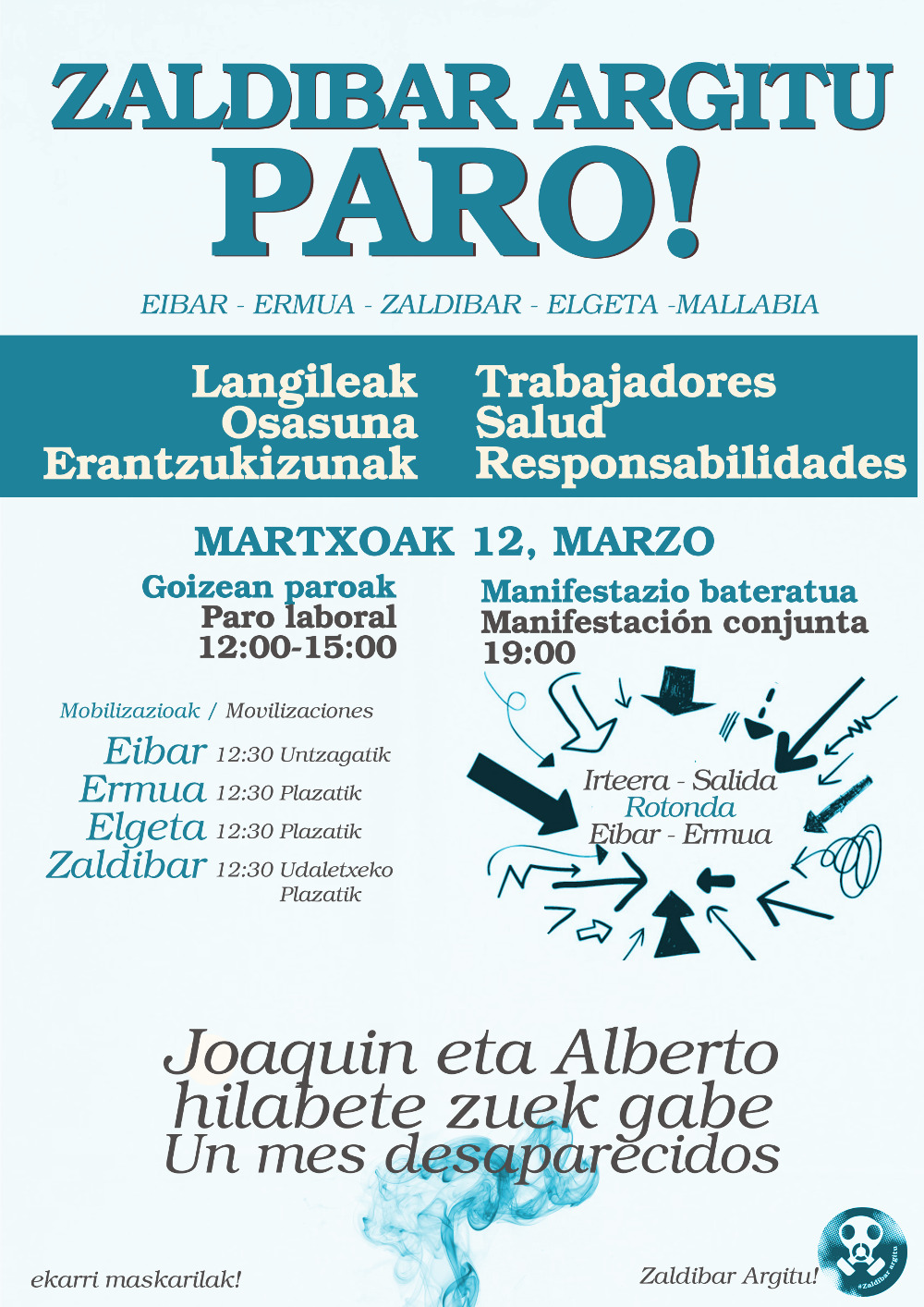 «Erreala ez den normaltasuna eteteko» martxoaren 12rako «paro herritarra» deitu du Zaldibar Argituk Zaldibarren bertan, Eibarren, Ermuan, Elgetan eta Mallabian. 12.00etatik 15.00etara deitu dute geldialdia; 12.30ean izango dira lehen mobilizazioak eta 19.00etarako mobilizazio bateratua deitu dute Eibar eta Ermua arteko biribilgunetik hasita.