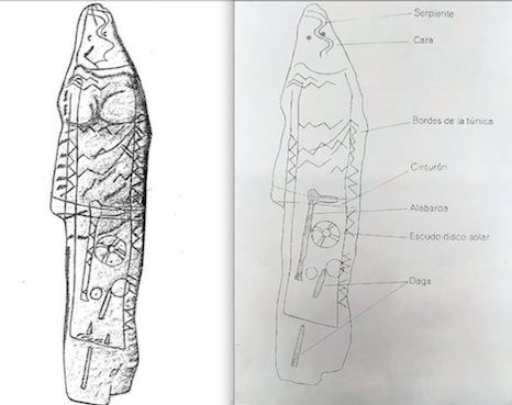 Un estudio realizado en 2004 por varios especialistas (Mimi Bueno, Rosa Barroso y Rodrigo de Balbín) confirmó que este menhir representa a un guerrero ataviado con una túnica y un cinturón del que cuelga una alabarda. También tiene dos dagas y una especie de disco solar que fue interpretado como su escudo, y en su cara aparecía una especie de serpiente.