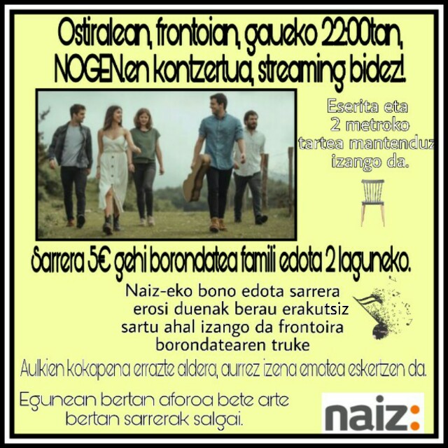 Gainera, sarrera edo bonua erosten duzuen edo erosita duzuen guztiok kontzertuaren grabaketa Azpeitiko Sanagustin Kulturgunetik zuzenean ikusteko sarrera bikoitzen zozketan sartuko zarete. Parte hartzeko, erosketaren pantailazo bat bidali behar da NAIZeko sare sozialen kontu batera (Instagram, Facebook edo Twitter), mezu pribatuaren bidez.