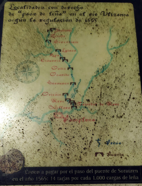 Varios paneles colocados en el Paseo del Arga, por iniciativa de la Mancomunidad de Iruñerria, ofrecen información sobre las ‘leñadas’, incluido un mapa del canon que los leñeros tenían que pagar en el año 1565 por el paso del puente de Sorauren.
