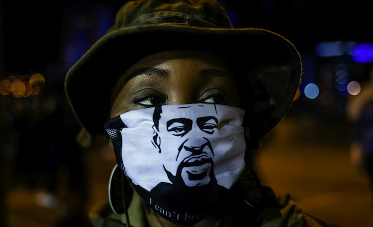 Manifestante con mascarill con la imagen de Breonna Taylor, víctima de brutalidad policial. Fotografía: Maranie R. Staab y Corey Sipkin | AFP