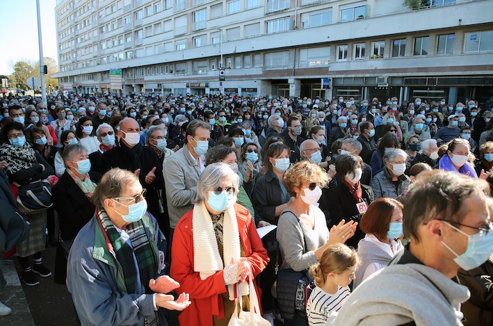 Estatu frantseseko puntu desberdinetan eginiko mobilizazioek milaka pertsona bildu dituzte, «Je suis prof» oihukatuz, adierazpen askatasunari buruzko eskola batean Mahomaren karikaturak erakutsi zituen Samuel Paty 47 urteko irakaslearen hilketa salatzeko. Protestetako bat Baionako suprefeturaren aurrean egin da.