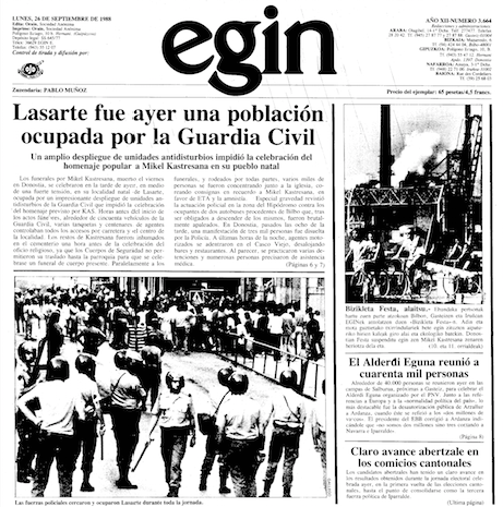 Bideoan jasotakoa 1988ko irailaren 25ean izan zen, igandearekin. Bi egun lehenago, arratsaldeko azken orduan, azken hatsa emana zuen Mikel Kastresana Razkinek, Donostiako Gipuzkoa Plazan, Poliziak tirokatuta, ETAko ‘Donostia komando’ko kide zelakoan.