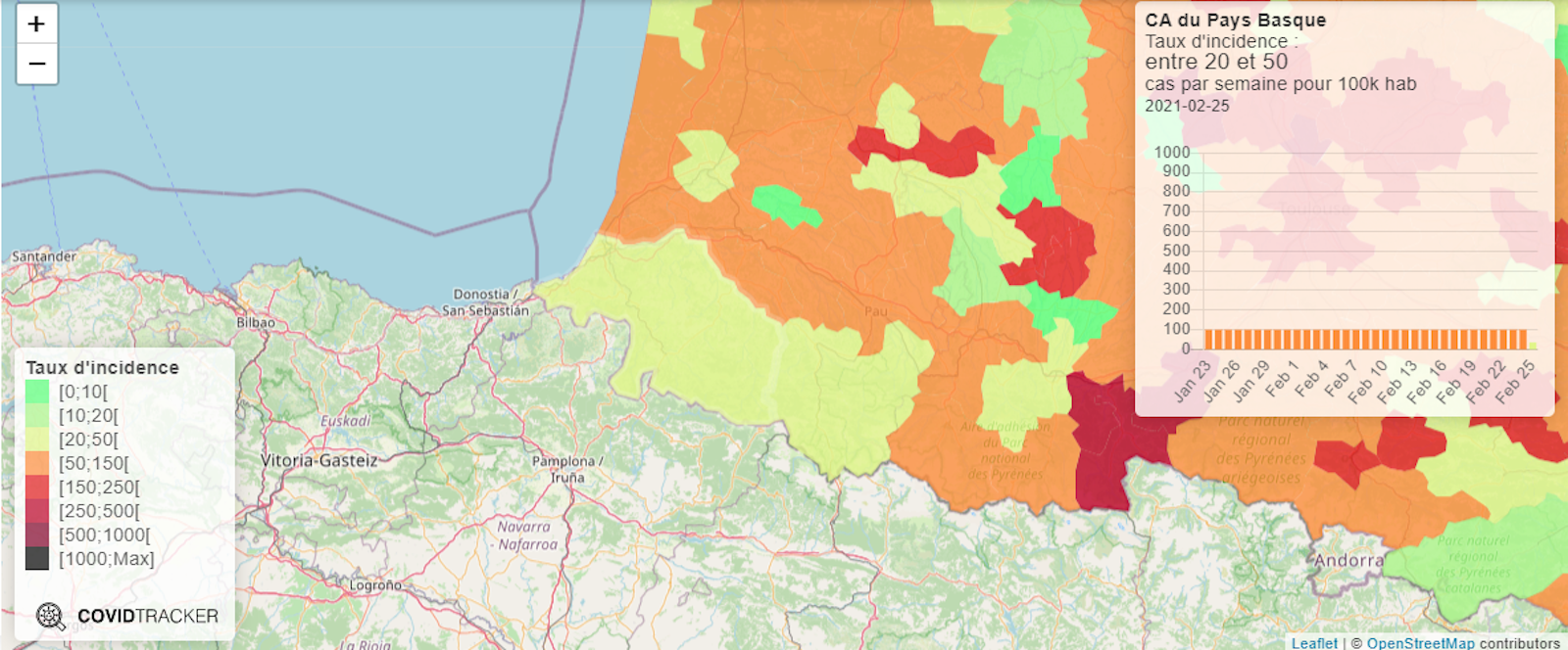 Izan ere Euskal Elkargoak estaltzen dituen 158 herri kontuan harturik CovidTracker neurgailu independenteak zehaztu duenez, dagoeneko 50 kasu azpiko langapean dira Zuberoa, Nafarroa Beherea eta Lapurdi. Hemen ikusgai dago mapa.