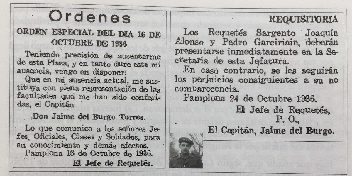 El historiador detalla que en la orden de nombramiento, «Ezcurra señaló ‘con plena representación de las facultades que me han sido conferidas (…) Lo que comunico a los señores jefes, oficiales, clases y soldados, para su conocimiento y demás efectos’. Ese mismo día se publicó una orden firmada por el Capitán de Requetés, que en virtud de aquel nombramiento era Jaime Del Burgo Torres, con fecha del mismo día 18 «p. o.», es decir, ‘por orden’».