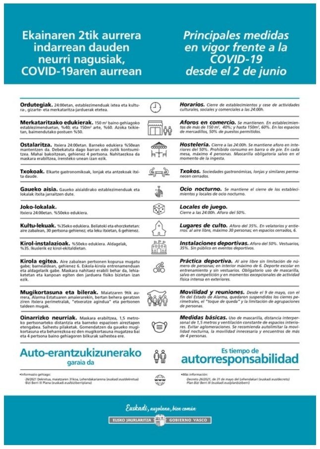 Preguntado también por si comparte la solicitud del presidente de Castilla-La Mancha, Emiliano García-Page, de que se suspenda la obligatoriedad de portar mascarillas en espacios abiertos antes de que concluya el mes de junio, Urkullu ha recordado que no es eso lo que se ha decidido en los órganos de coordinación interautonómicos y que sigue defendiendo el uso de la mascarilla hasta que haya criterios técnicos que permitan una relajación de la medida. «Nos hemos enterado de esa propuesta por los medios. Pero hay una orden de obligado cumplimiento, no nos corresponde a nosotros tomar esas decisiones. En el caso de que me toque a mí tomarla, defiendo que hay que seguir llevándola.