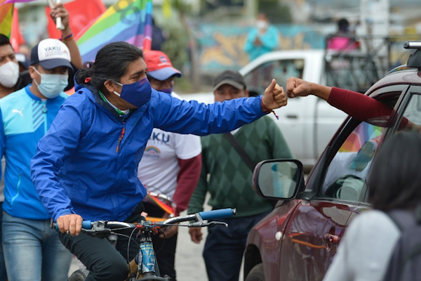 Montado en una bicicleta, vistiendo jeans y una chaqueta azul, Yaku Pérez, un activista contra la minería, se lanzó a conquistar votantes.