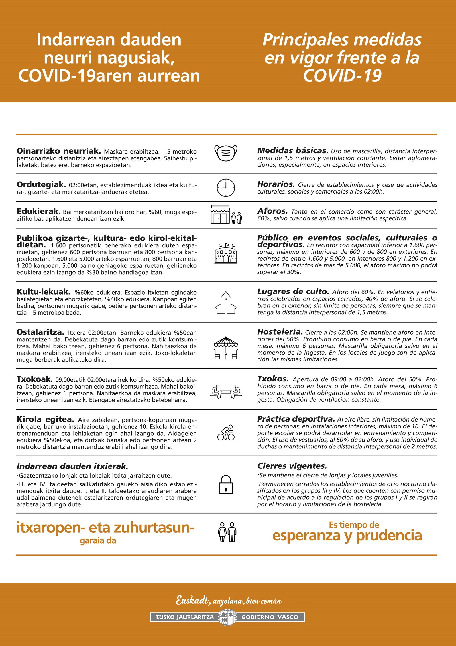 Estas medidas se revisarán dentro de quince o veinte días como máximo, según ha dicho Urkullu, con el objetivo de confirmar que la tendencia en la incidencia de contagios y en la presión hospitalaria sigue a la baja.