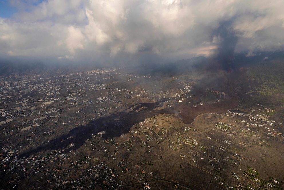 La columna eruptiva ya alcanza una altura de seis kilómetros sobre el nivel mar y se ha constatado que la colada principal (la más antigua) avanza a una velocidad menor a 1 metro por hora, si bien ha aparecido una nueva colada que se emplaza a lo largo del flanco sur.