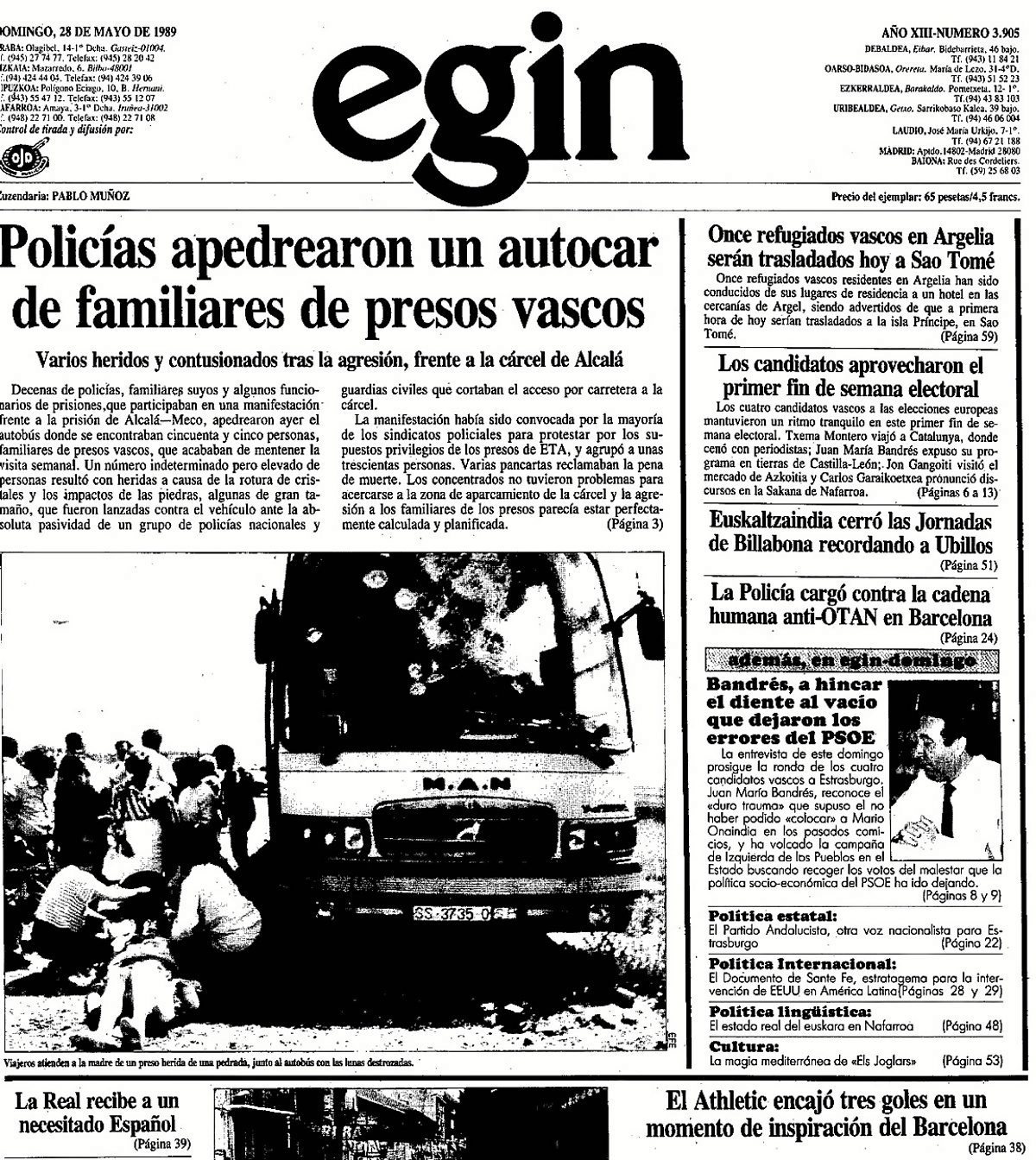1989ko maiatzaren 28ko “Egin” egunkariak jaso zuen albistea. Zenbait polizia sindikatuk manifestazioa deitu zuten bezperan –euskal presoen senideen bisita egunarekin bat eginez– «ETAko presoen pribilegioak» salatzeko. Hamarnaka pertsona elkartu ziren deialdira, tartean polizia ugari, espetxeetako funtzionarioak eta batzuen eta besteen emazteak. Manifestariek gogor eraso zioten tamaina handiko harriak jaurtiz senideen autobusari, horiek barruan zirela. Autobusa birrindu egin zuten eta zaurituak eragin zituzten. Berez manifestazioa kontrolatzera joandako poliziek ez zuten ezer egin erasoa eragozteko.