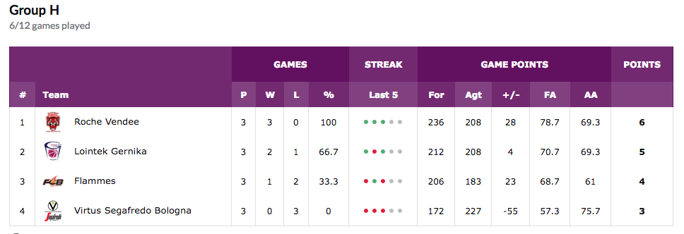Mahaigainean kolpea eman zuen Lointek Gernikak aurreko astean Flammes Carolo Basket taldeari 58-69 irabazita. Garaipen horrek H multzoko bigarren posturaino altxa zuen talde bizkaitarra, eta asteazken honetan (20.00, ETB4) beste aukera bikain bat du du sailkapeneko goiko postu horietan mantentzeko, eta zeinek daki, lidertza lortzeko. Horretarako, Virtus Boloniari irabazi beharko lioke eta Roche Vendee liderrak Flammes Carolo Basketen etxean galdu beharko luke (20.00).