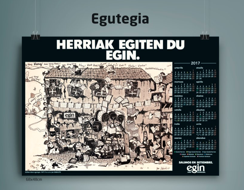Los calendarios que hacen propaganda y recolectan fondos para organismos populares, partidos y otras iniciativas sociales han alegrado también durante años muchas paredes. La original serie que pintó el ya fallecido Paco López para el ecologismo navarro (en tamaño pared o bolsillo) es una vívida muestra de los tiempos de proto activismo ambientalista. Proliferaron también iniciativas como la de Seaska, federación de Ikastolas de Ipar Euskal Herria, con su calendario en forma de tira.
