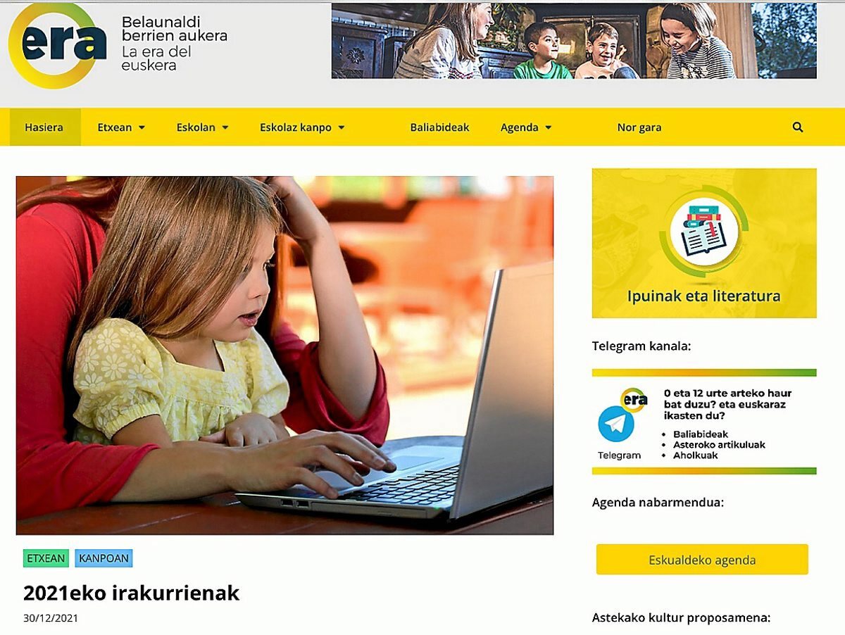Hamabi urte arteko haurren familiei zuzenduta, Era.eus euskaraz bizitzeko eta euskal kulturan murgiltzeko uneak sortzen laguntzen dituzten baliabide ezberdinak eskaintzen dituen atari digitala da. Familien eskura jarritako tresna, halere, harago doan ekimena ere bada. Ez da proposamen ezberdinen erakusleiho hutsa izatera mugatzen. Asteroko artikuluek, aholkuek, ahots ezberdinen mezuek… proposamen dibertsoago bat osatzen dute, euskara eta haurren mundua ardatz dituen plataforma zabal bat eratuz. Adinaren arabera edo egoera eta testuinguru ezberdinetan jarrita, baliabide bakoitzak euskararen transmisioan laguntzeko jokatzen duen papera azaltzen du webguneak, eta hori ere azpimarragarria da, euskara ohiko hizkuntza ez duten etxeetan laguntza osatuago bat ematen duelako.